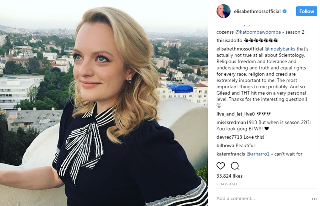 Elisabeth Moss defends Scientology after fan compares it to 'Glilead